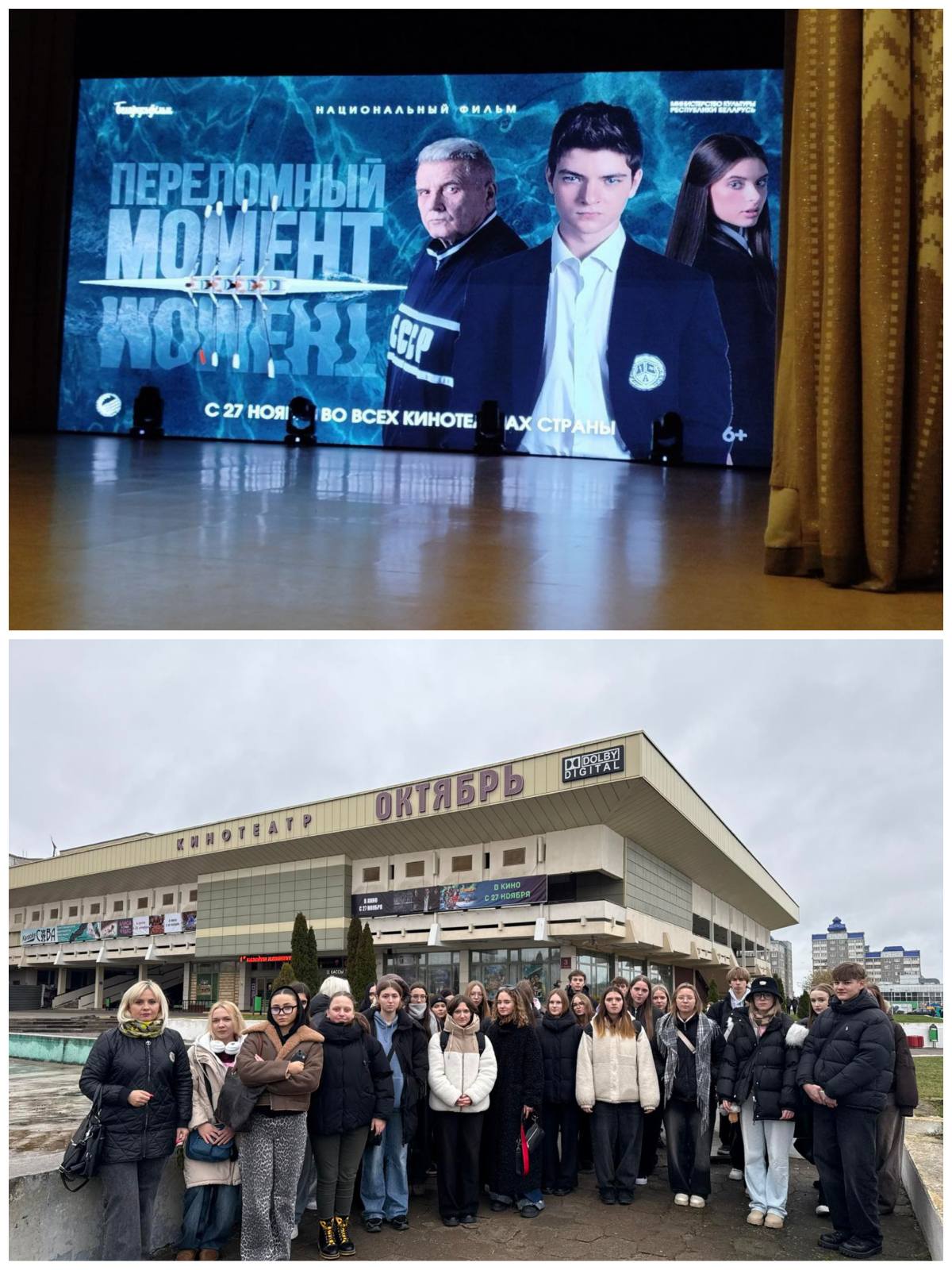3 декабря 2025 года руководитель по военно‑патриотическому воспитанию Чайковская Е. В. вместе с учащимися посетила кинотеатр «Октябрь», где состоялась премьера фильма студии «Беларусьфильм» «Переломный момент».