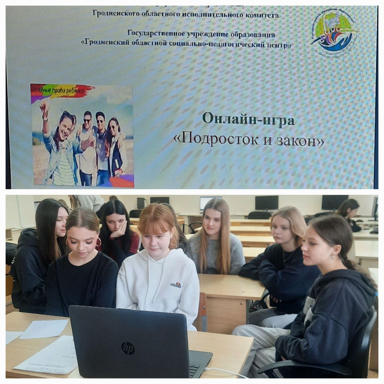 20 ноября 2025 года учащиеся 11 О-Б группы приняли участие в онлайн-игре «Подросток и закон», организованной ГУО «Гродненский областной социально-педагогический центр». В ходе игры ребята вспомнили об основных международных документах, защищающих права детей, свои права, как граждан Республики Беларусь, закрепили знания о правах, обязанностях, ответственности несовершеннолетних.