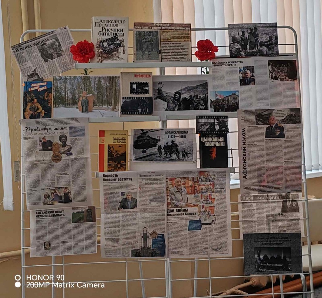В преддверии дня памяти воинов интернационалистов 13 февраля в читальном зале библиотеки проводится выставка — обзор «Афганистан в судьбе нашей страны». На выставке представлена информация из средств массовой информации о судьбах белорусов служивших в Афганистане, художественные произведения.