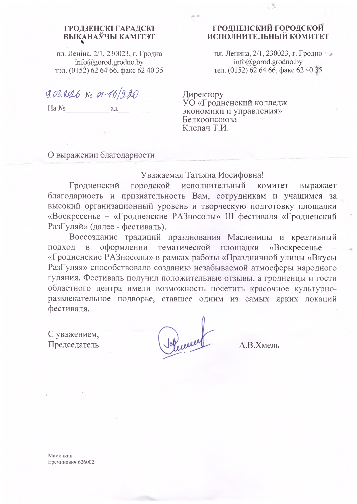 11 марта 2026 года, в преддверии Дня Конституции Республики Беларусь, руководитель по военно-патриотическому воспитанию Е. В. Чайковская провела для учащихся группы 12Фн-Б викторину под названием «Мир права. Конституция Республики Беларусь». Мероприятие было направлено на повышение правовой грамотности и патриотического сознания молодежи. В конце викторины все участники получили символические подарки, которые напоминали о важности Конституции и правовых основах государства.
