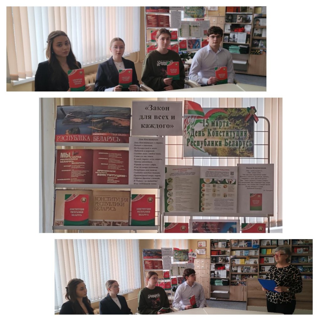 В преддверии Дня Конституции Республики Беларусь, в библиотеке колледжа 13 марта прошёл информационный дайджест «Закон для всех и каждого». Цель: способствовать воспитанию чувства гордости за свою страну, уважению к Конституции Республики Беларусь. На мероприятии Ирина Андреевна ознакомила учащихся, с историей создания белорусского государства, которая насчитывает пять Конституций.
