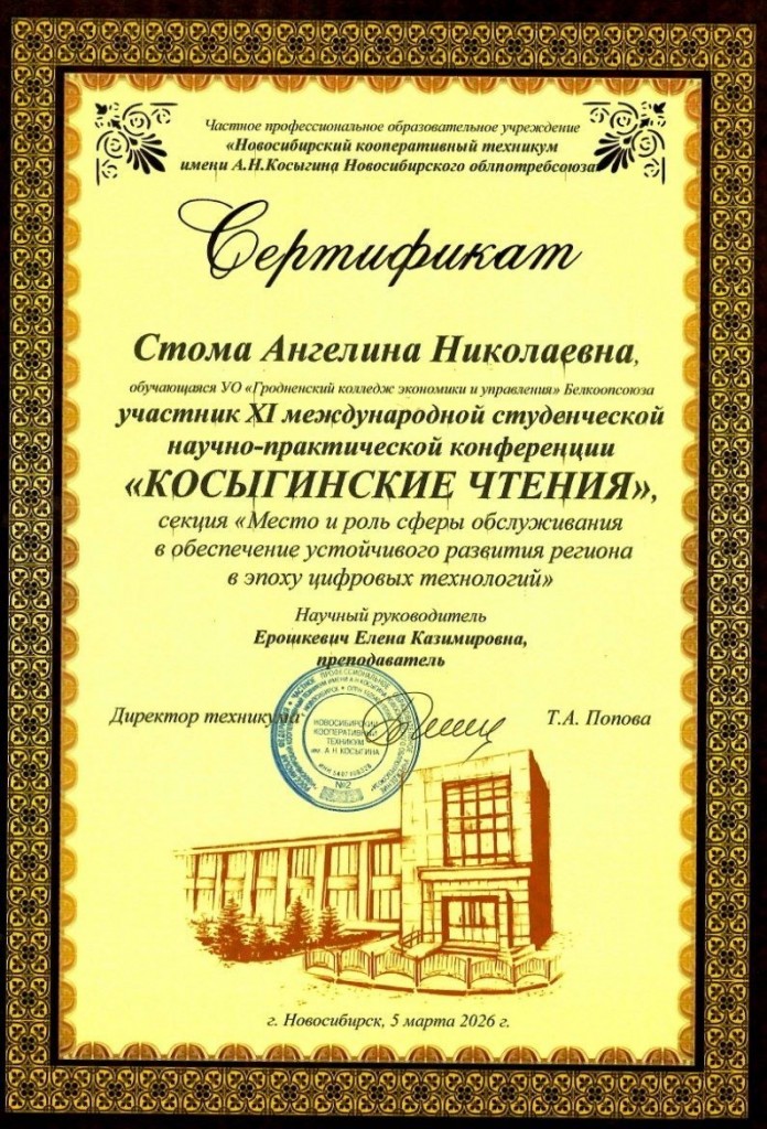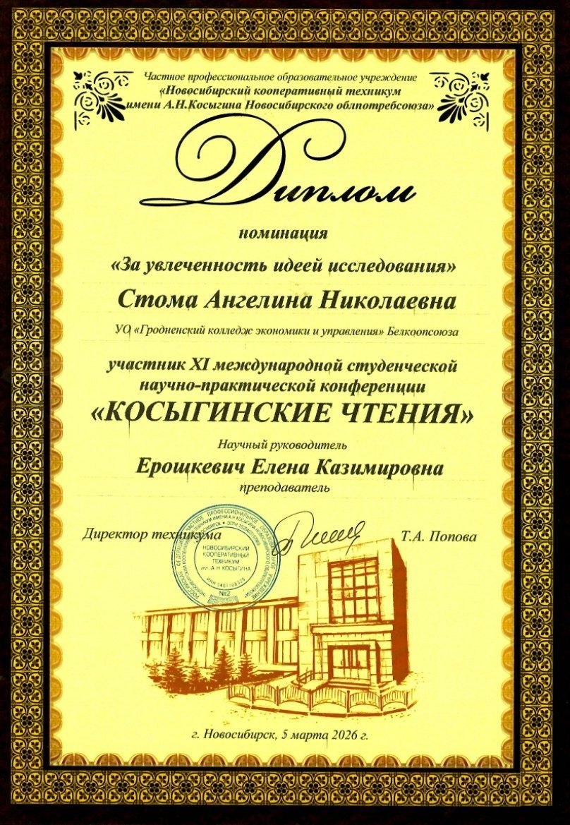 Учащаяся 21 О-Б группы специальности «Операционная деятельность в логистике» Стома Ангелина под руководством преподавателя Ерошкевич Елены Казимировны приняла участие в XI международной студенческой научно-практической конференции «Косыгинские чтения», посвящённой Десятилетию науки и технологий в Российской Федерации и 18-летию со дня присвоения Новосибирскому кооперативному техникуму имени А.Н.Косыгина, проводимой в Новосибирском кооперативном техникуме имени А.Н.Косыгина Новосибирского облпотребсоюза. Цель конференции – побуждение участников к научно-исследовательской деятельности, формирование у студентов учреждений СПО и учащихся школ мотивации и способностей к самостоятельному мышлению, готовности к самоопределению в вопросах профессиональной деятельности. На конференции были представлены 130 исследовательских работ. Работа Стома Ангелины на тему «Система маркировки товаров кодом DataMatrix: новые правила игры» была отмечена дипломом в номинации «За увлеченность идеей исследования».