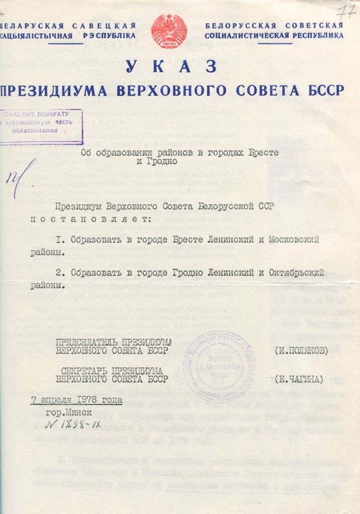 Этот день стал точкой отсчета для одного из самых больших и динамично развивающихся районов нашего города. Указом Президиума Верховного Совета БССР от 7 апреля 1978 года был официально образован Октябрьский район г. Гродно.