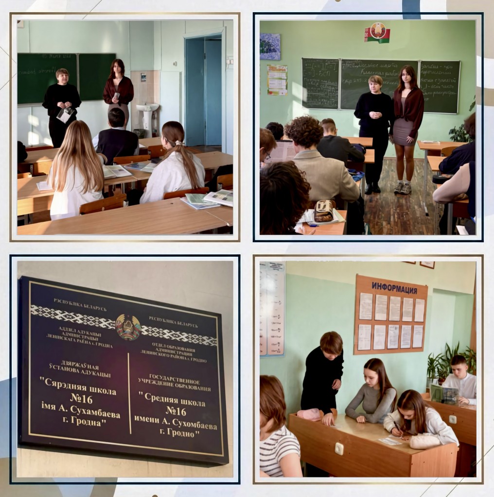 10 марта 2026 года преподаватель Сакута О.С. и учащиеся 21 О-Б группы посетили ГУО «Средняя школа №16 имени А.Сухомбаева г. Гродно» с целью профориентации выпускников 9-х классов. Учащиеся школ были ознакомлены со специальностями, по которым ведется подготовка специалистов в колледже, правилами поступления и обучения, возможностями поступления после окончания колледжа в ВУЗы на сокращенный срок обучения.