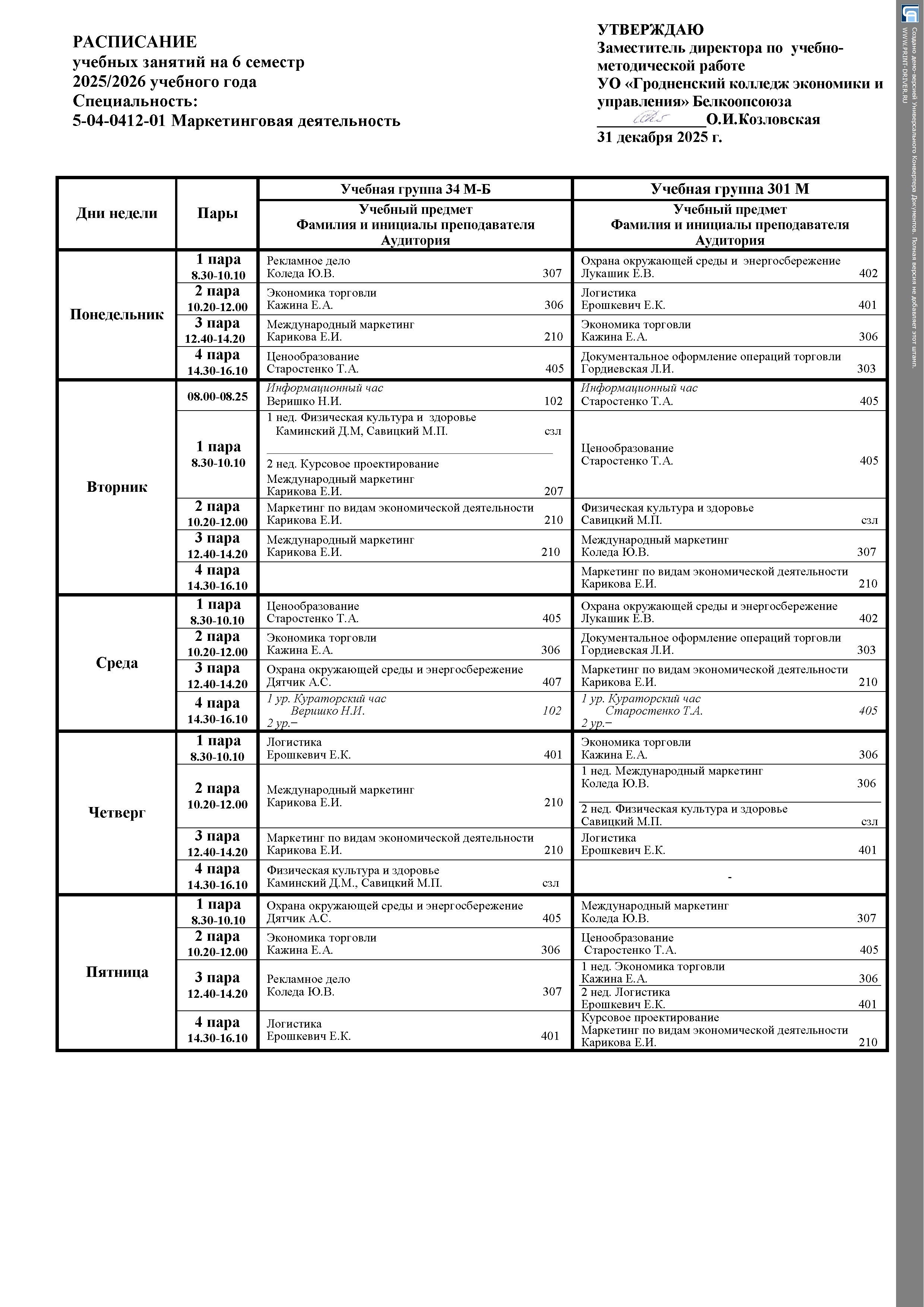 Расписание занятий Дневное отделение