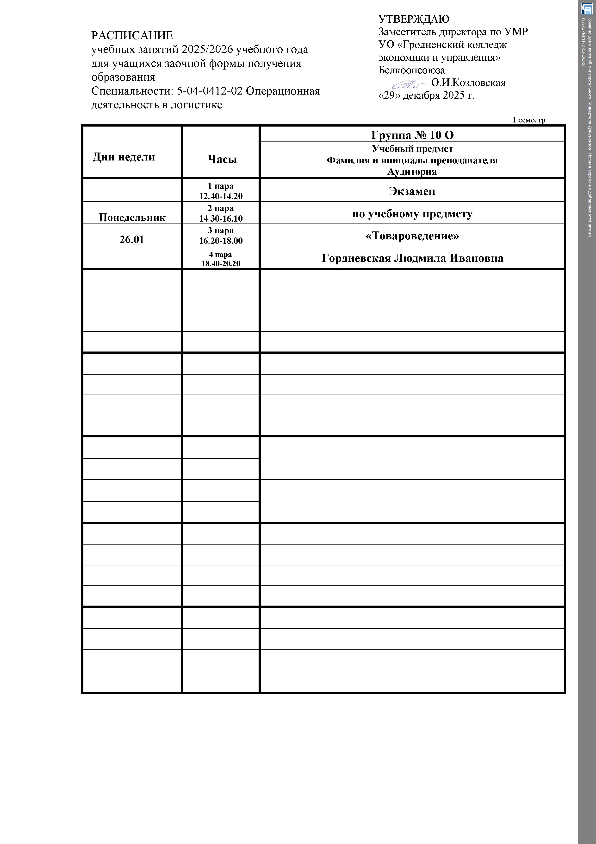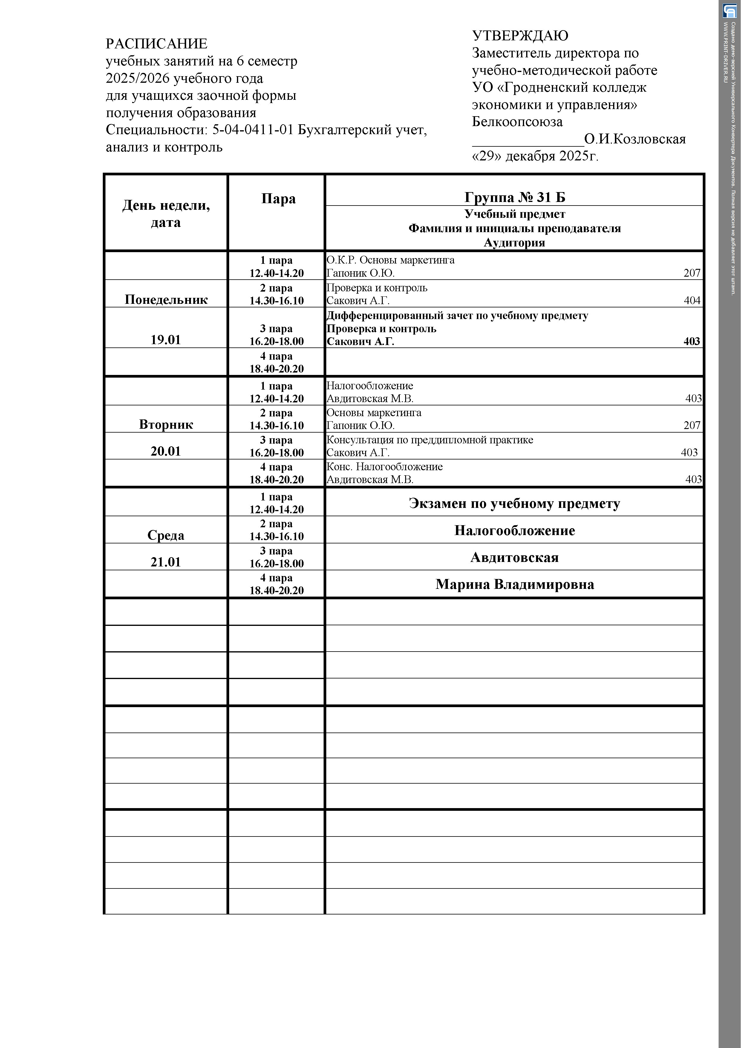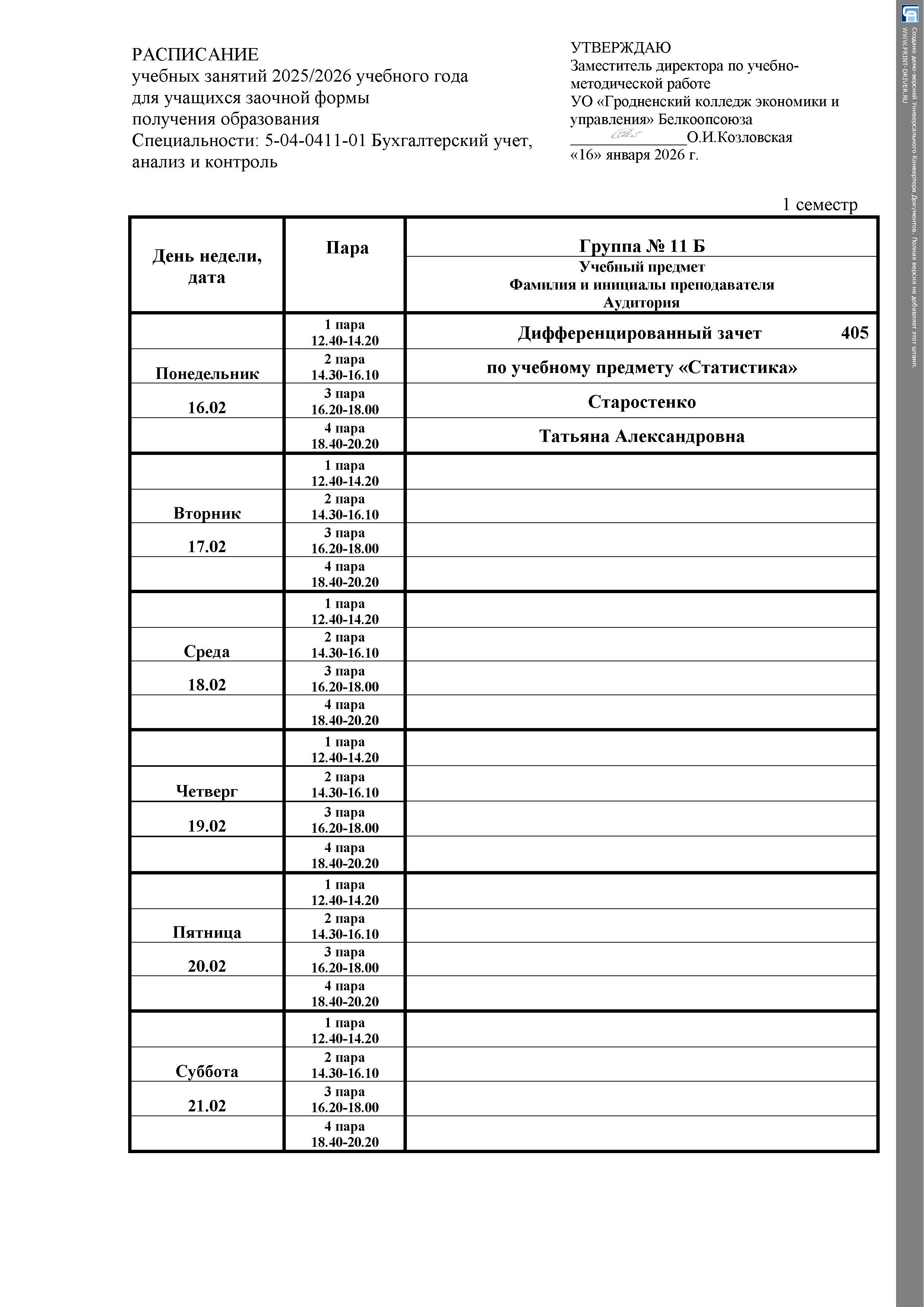 Расписание занятий Заочная форма получения образования