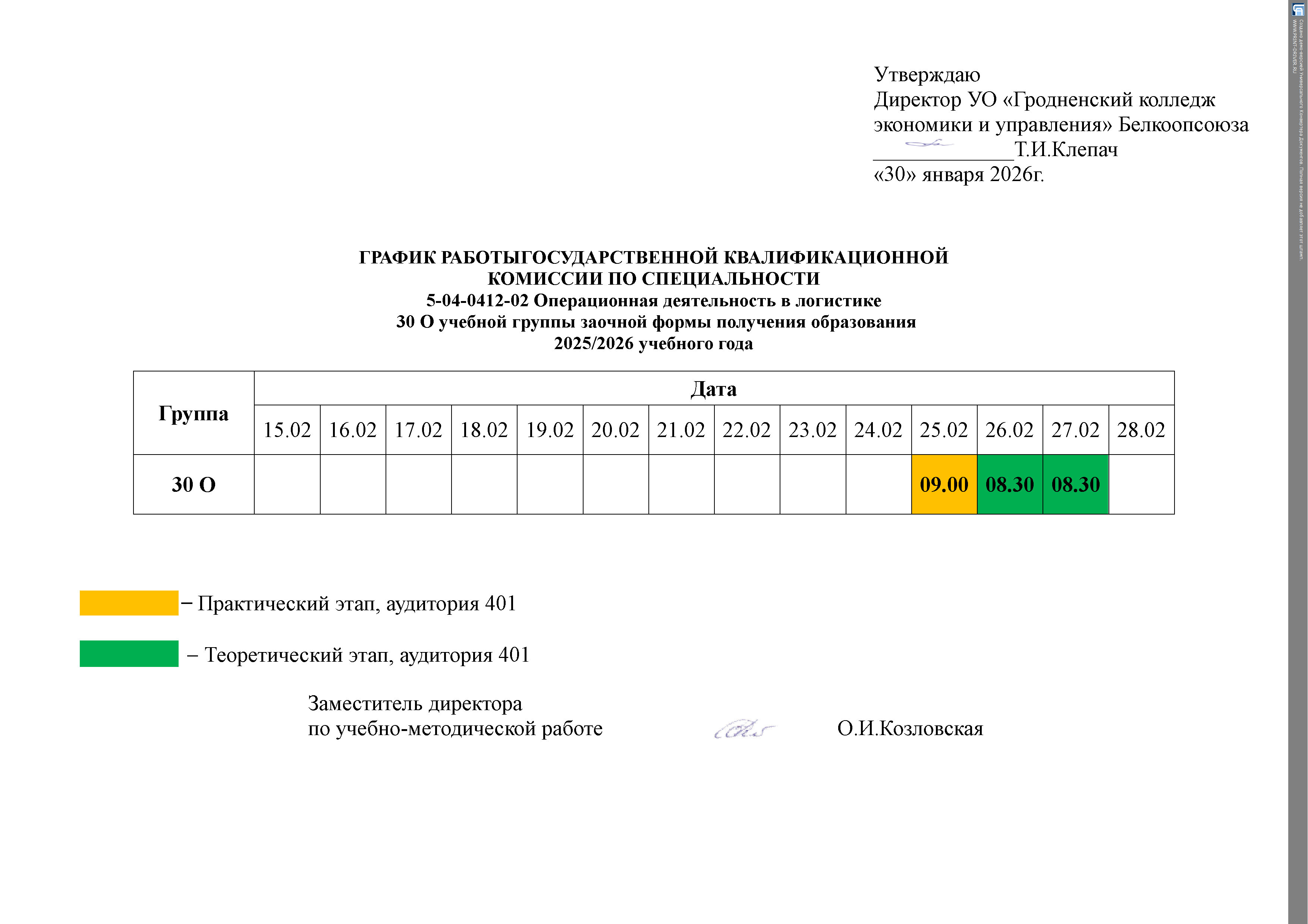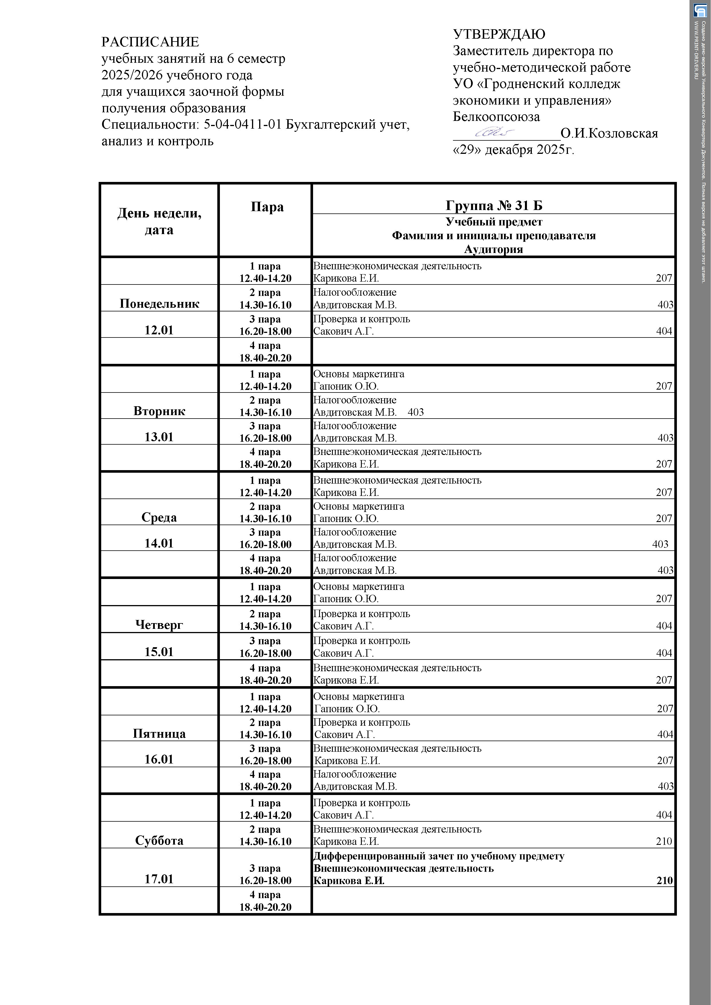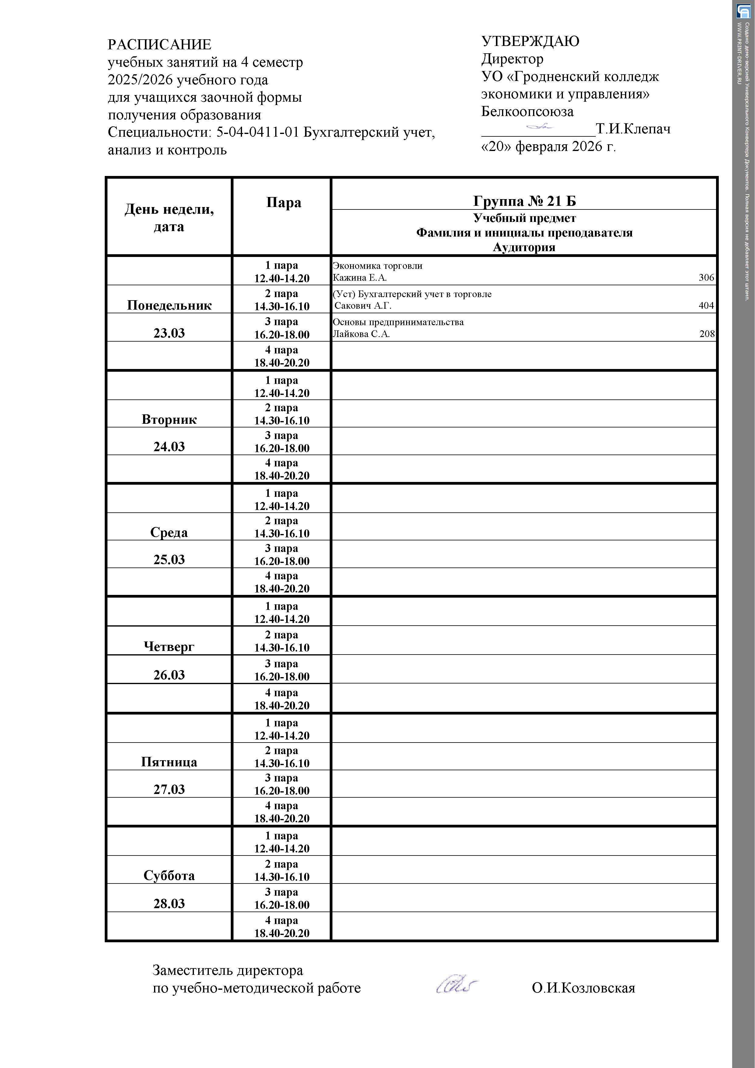 Расписание занятий Заочная форма получения образования
