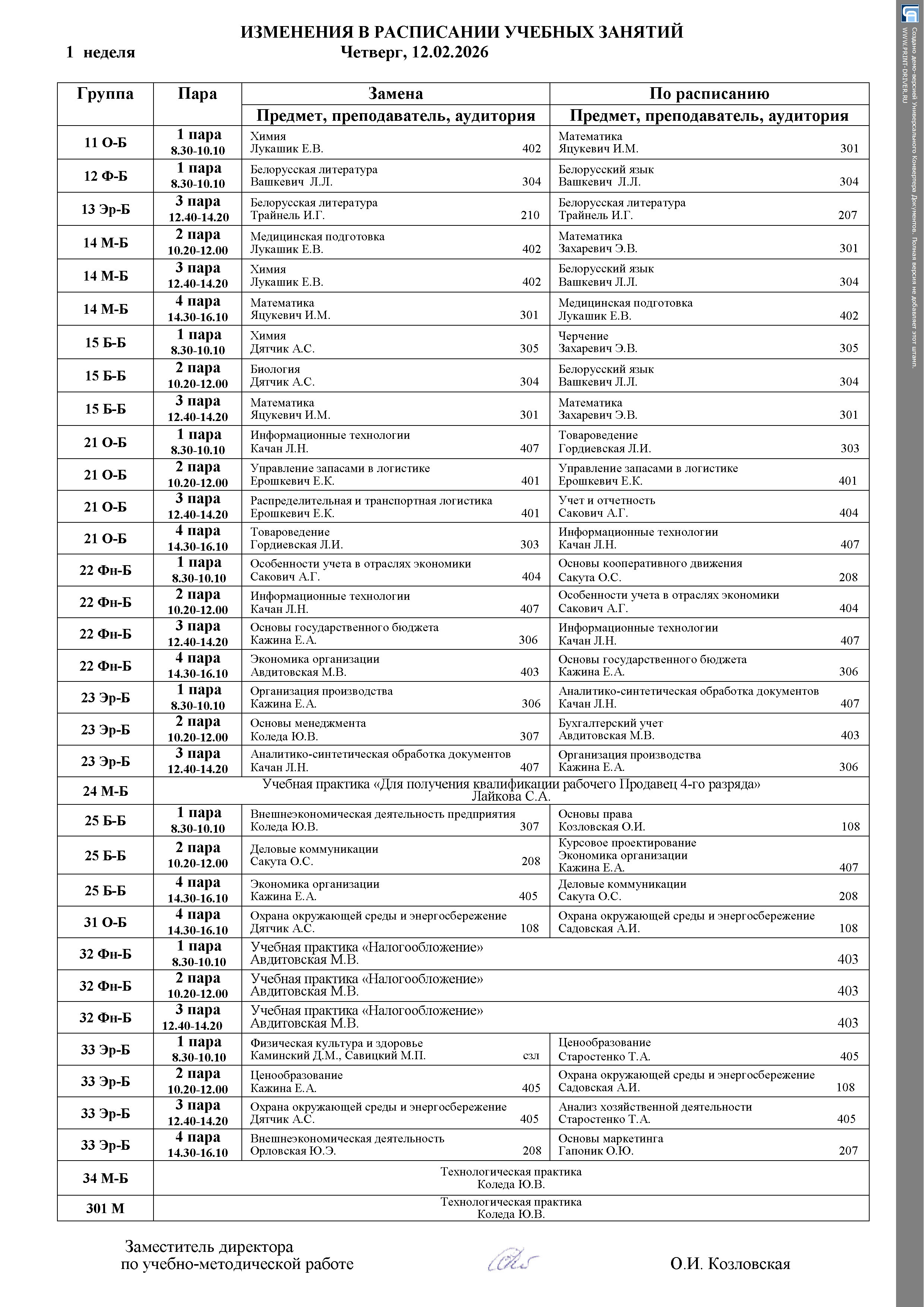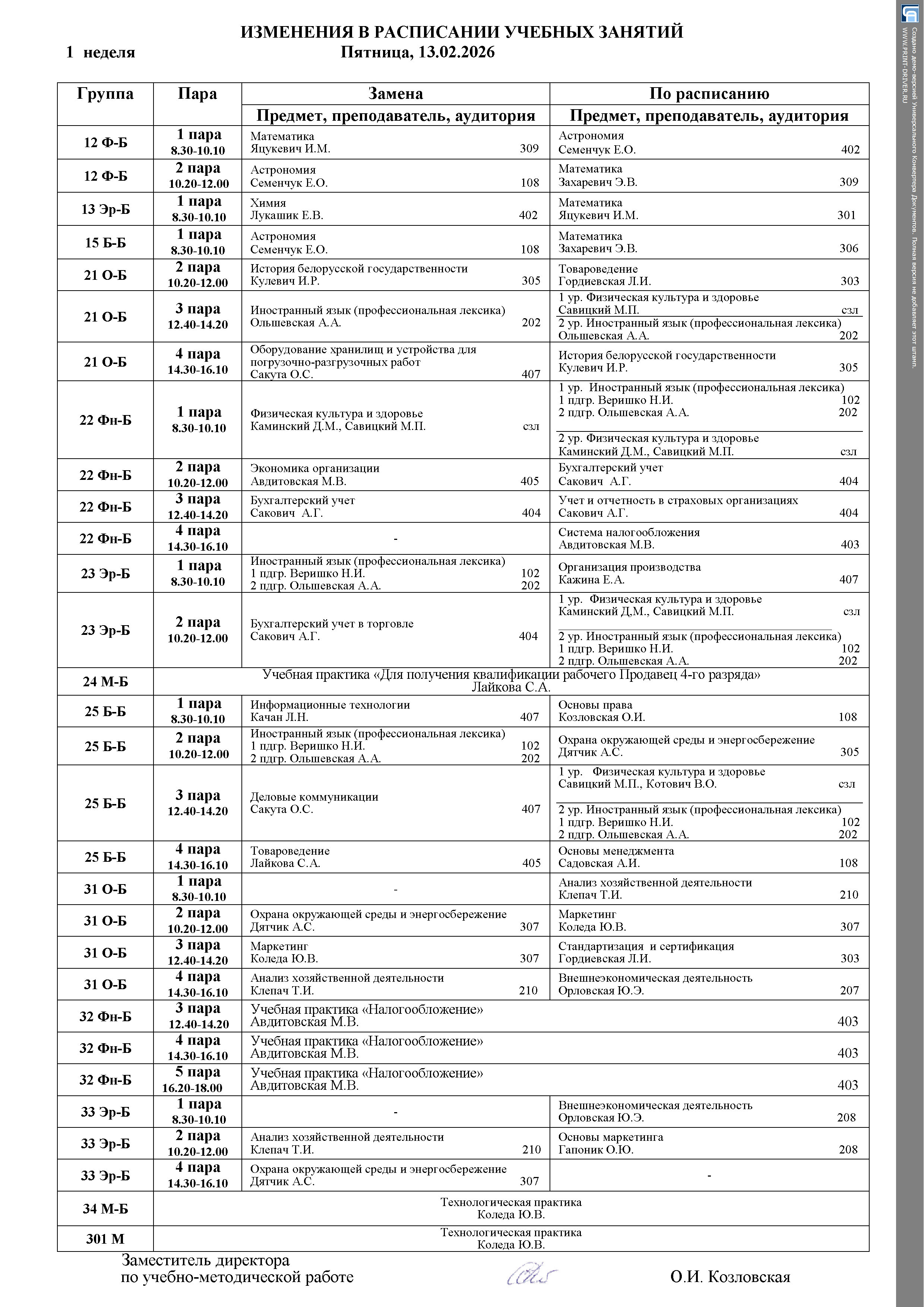 Расписание занятий (замены)