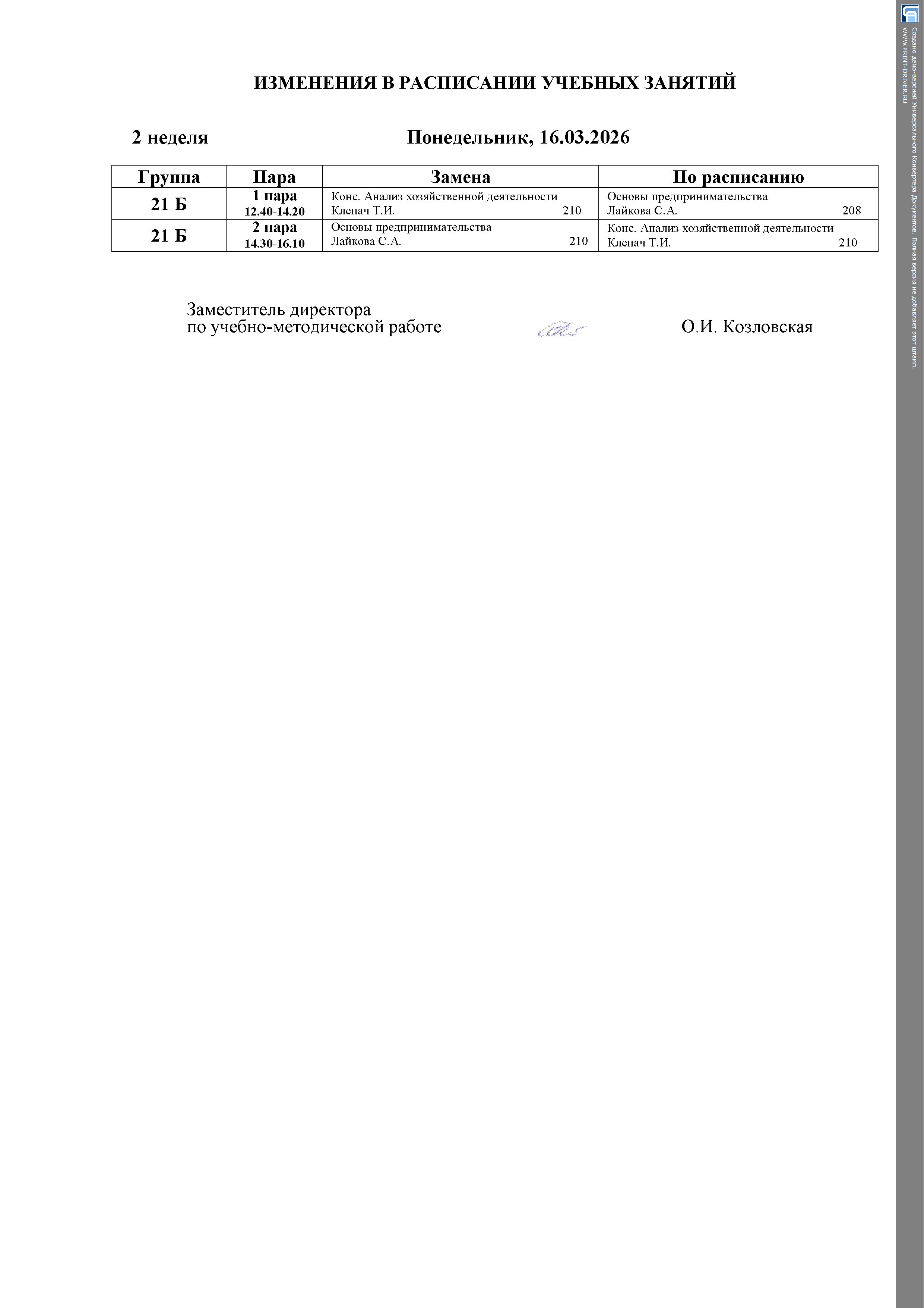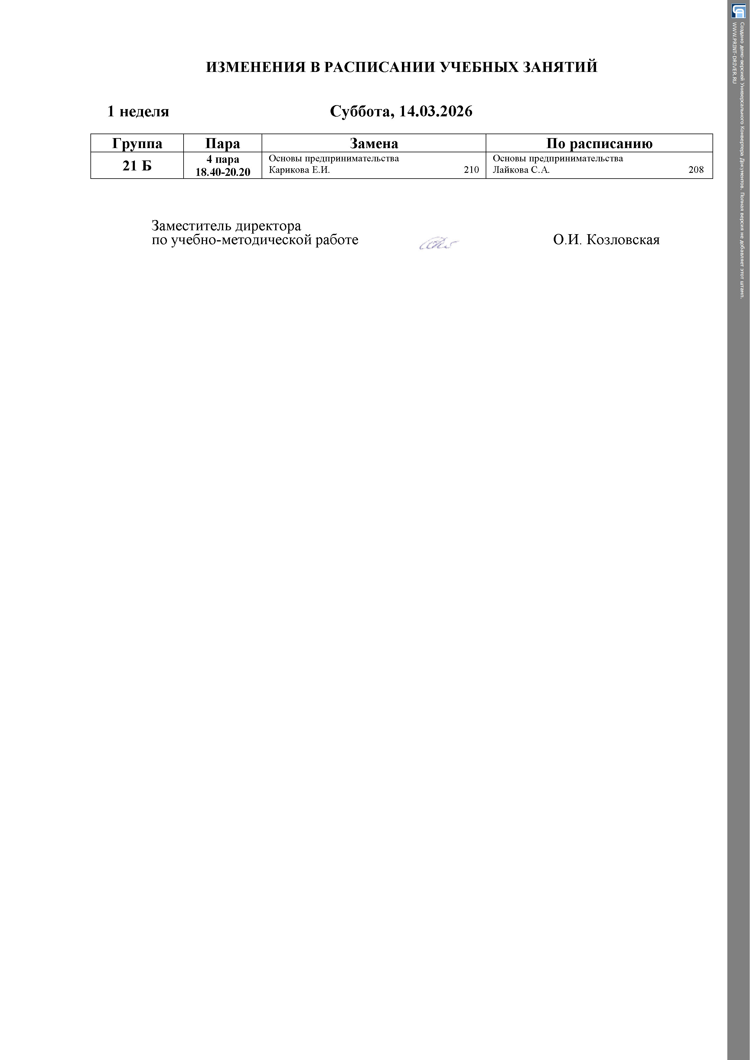 Расписание занятий (замены)
