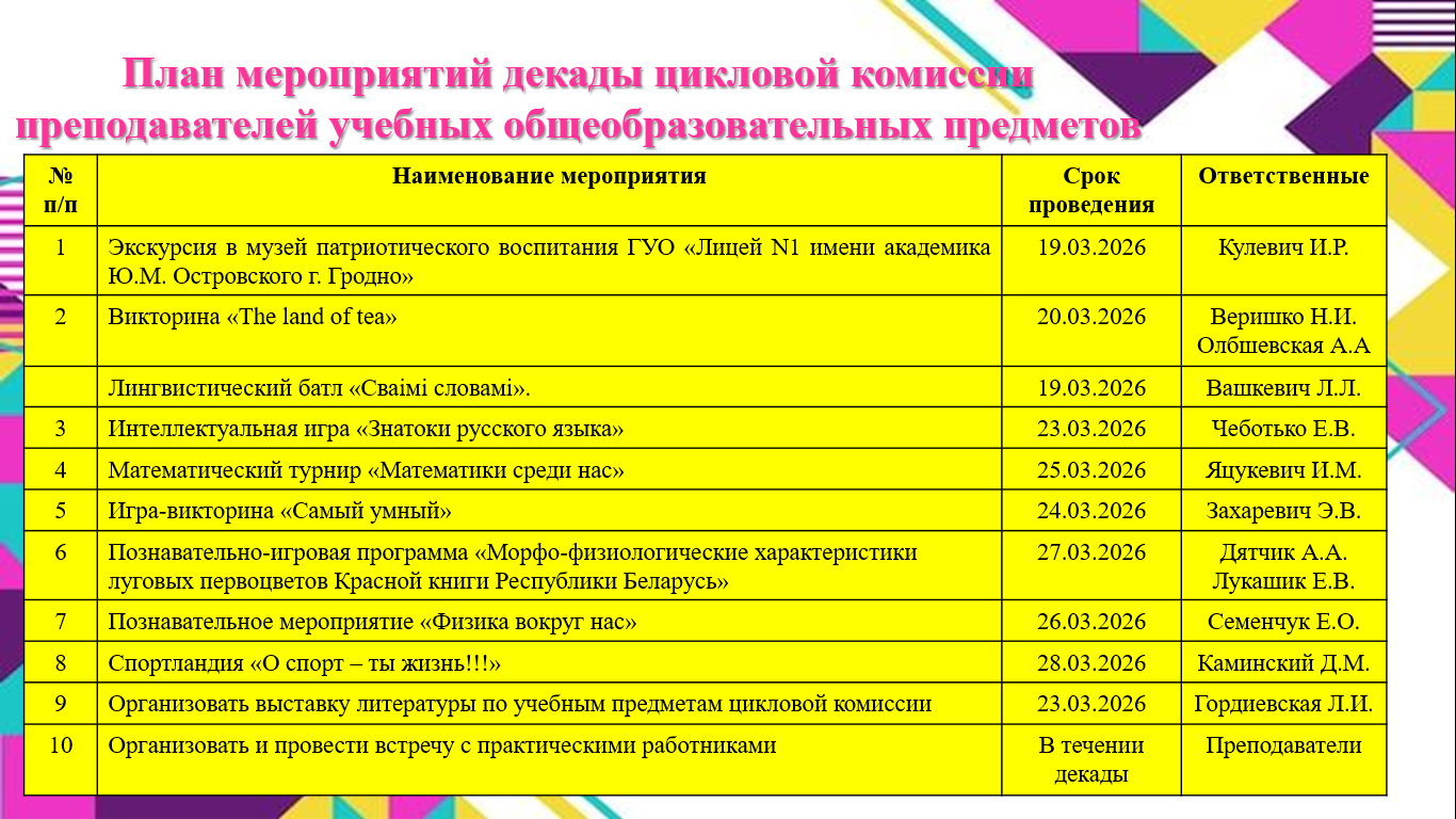 С 19 марта по 28 марта 2026 декада цикловой комиссии преподавателей учебных общеобразовательных предметов
